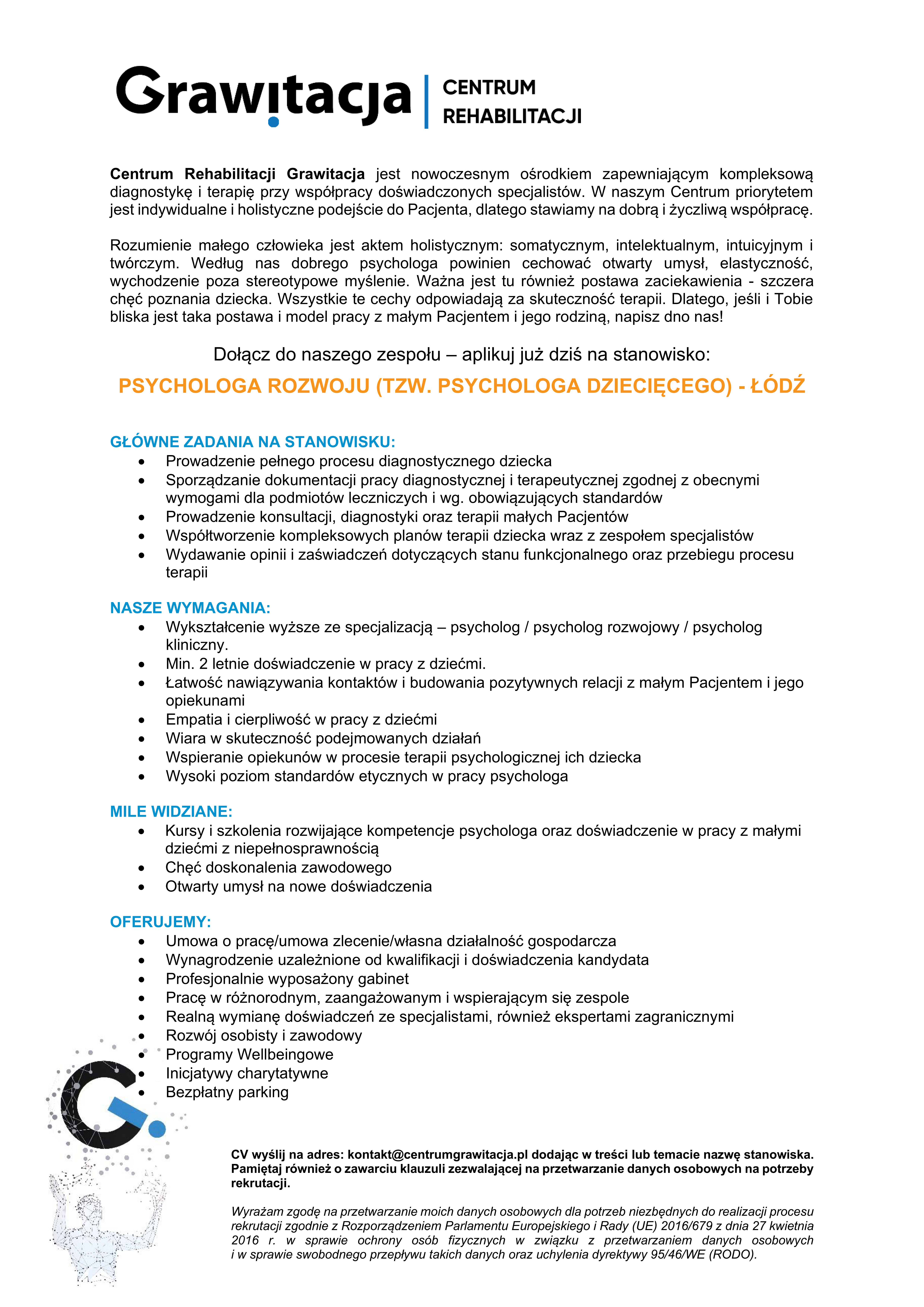Centrum Rehabilitacji Grawitacja jest nowoczesnym ośrodkiem zapewniającym kompleksową diagnostykę i terapię przy współpracy doświadczonych specjalistów. W naszym Centrum priorytetem jest indywidualne i holistyczne podejście do Pacjenta, dlatego stawiamy na dobrą i życzliwą współpracę. Jeżeli chcesz do nas dołączyć, to zapoznaj się z dostępnymi ofertami pracy i prześlij nam swoje CV.