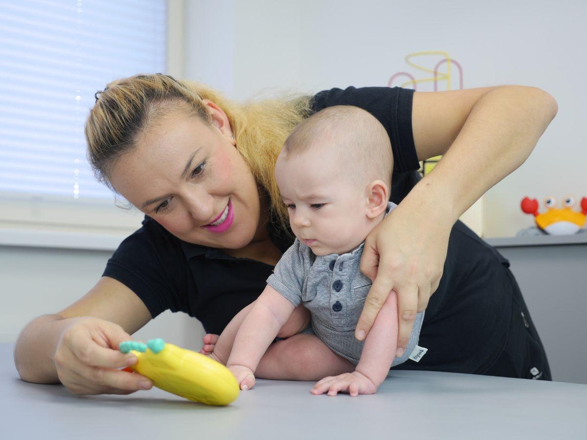 Turnus rozpoczynamy od badania dziecka oraz wywiadu z rodzicem. Terapeuta ocenia napięcie mięśniowe, zakresy ruchomości oraz aktualny etap rozwoju motorycznego i poznawczego. Obserwujemy, w jaki sposób niemowlę inicjuje ruchy, jak reaguje na bodźce sensoryczne oraz jak radzi sobie z zadaniami adekwatnymi do wieku.
