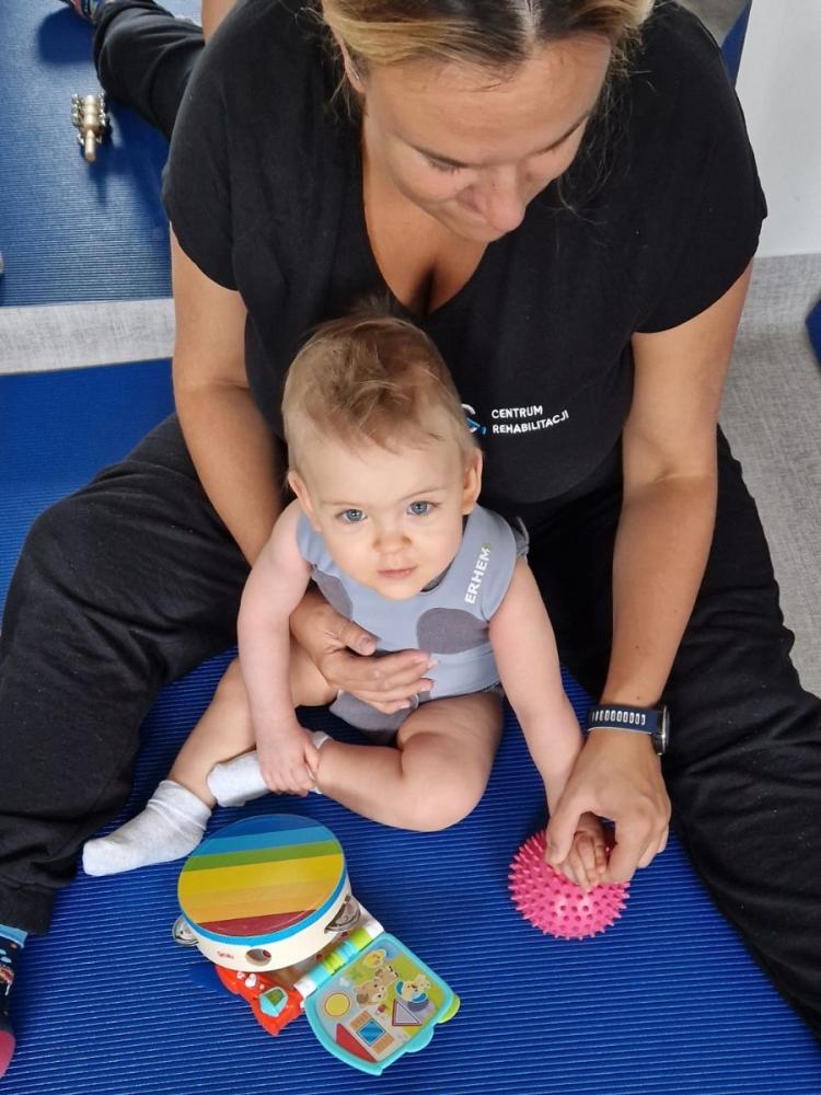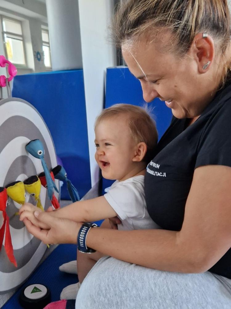 Rodzic bierze udział w terapii — omawiamy sposób podawania zabawek, ustawienia dziecka podczas zabawy, oraz przekazujemy wskazówki, jak wspierać aktywność kończyny osłabionej w domu.